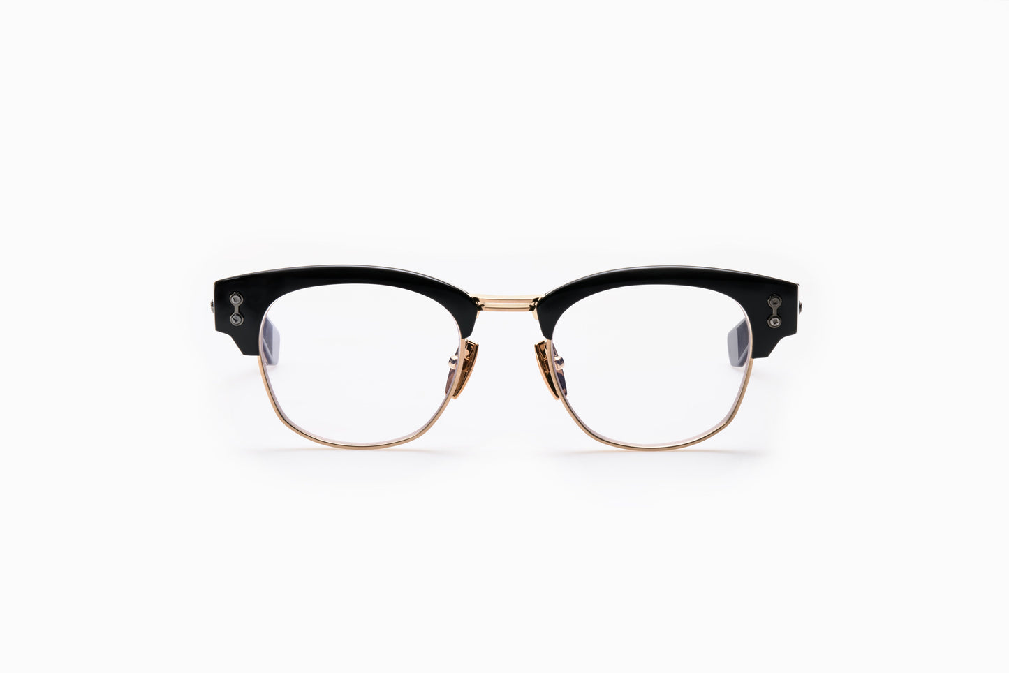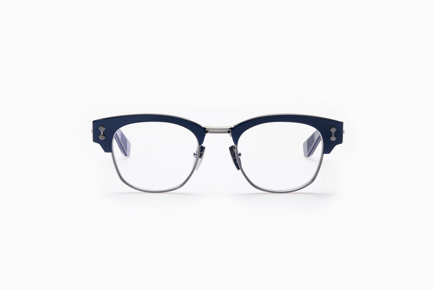 The Newton frame from Collection VIII is a bold update on the classic Clubmaster style, crafted to make a strong statement. Featuring thick acetate temples and a robust titanium eye rim, the Newton frame stands out with its distinctive contrast and elevated design.
